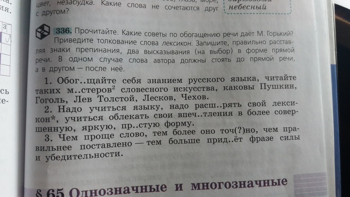 Обогащайте, мастеров, расширять, впечатления, простую, точно, придает. - проп.буквы. Совет Горького- Нужно больше уделять вниманию своей речи, пополнять словарный запас, следовать правилам русского языка, быть грамотным. Лексикон- ваш словарный запас, толкование некоторых слов.