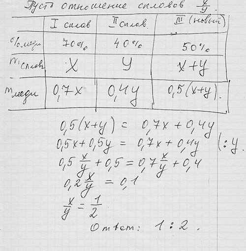 Имеется два сплава с разным содержанием меди: в первом содержится 70%, а во втором — 40% меди. В каком отношении надо взять первый и второй сплавы, чтобы получить из них новый сплав, содержащий 50% меди?