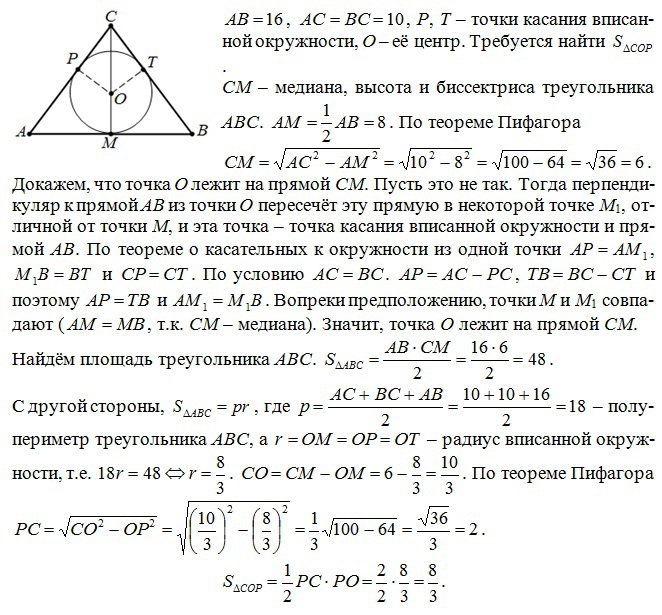 окружность с центром о, вписанная в равнобедренный треугольник, касается боковых сторон АС и ВС в точках Р и Т. найти площадь треугольника СОР, если основание треугольника равно 16, а боковая сторона равна 10 см