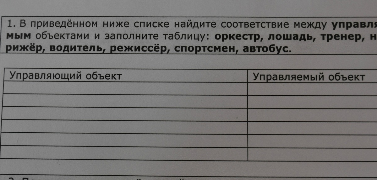 В приведённом ниже списке найдите соответствие между управляющим и управляе-мым объектами и заполните таблицу: оркестр, лошадь, тренер, наездник, актёр, ди-рижёр, водитель, режиссёр, спортсмен, автобус.