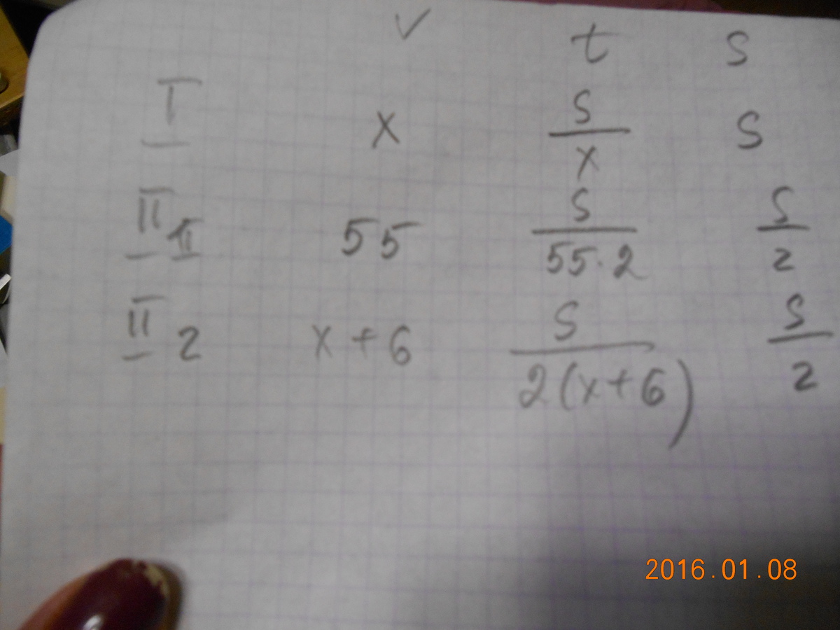 Из А в В одновременно выехали два автомобилиста первый проехал с постоянной скоростью весь путь. Второй проехал первую половину пути со скоростью 55 км, а вторую половину пути проехал со скоростью на 6 км больше скорости первого, в результате чего прибыл в В одновременно с первым автомобилем. Найти скорость первого автомобилиста.
