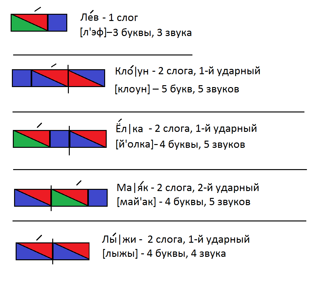 Построить звуковую модель слов. Гласные звуки -красные, согласные твёрдые - синие, согласные мягкие звуки - зелёные. Слова: лев, клоун, ёлка, маяк, лыжи.