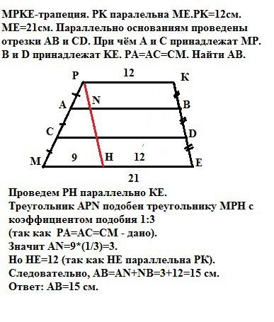 MPKE-трапеция.PK паралельна ME.PK=12см.ME=21см.Параллельно основаниям проведены отрезки AB и CD.При чём A и C принадлежат MP. B и D принадлежат KE. PA=AC=CM.Найти AB.