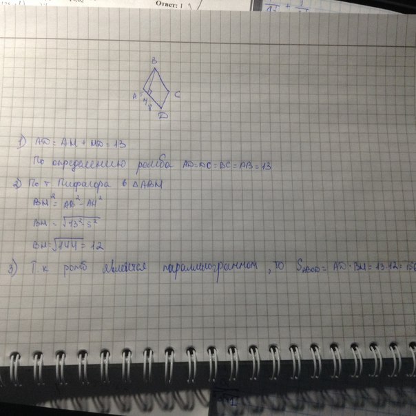 Высота BH ромба ABCD делит его сторону AD на отрезки AH = 5 и HD = 8. Найдите площадь ромба.