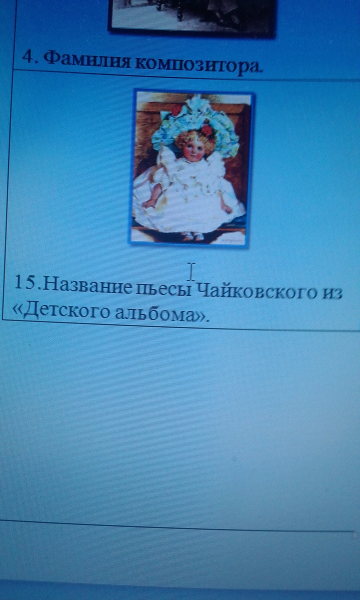 На картинке изображена кукла. У Чайковского есть несколько произведений, написанных о кукле: "Болезнь куклы", "Похороны куклы" и "Новая кукла". Судя по некой позитивности этой картинки , я считаю, что это все же пьеса "Новая кукла"