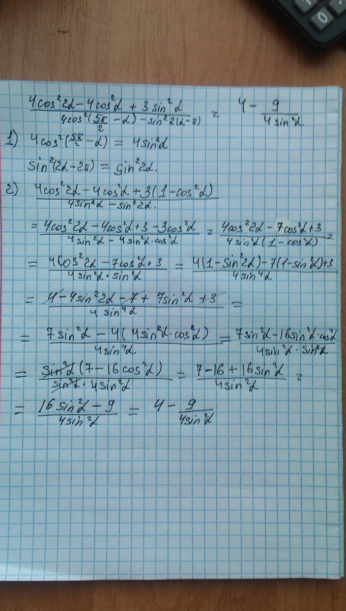 4cos^2•2α-4cos^2α+3sin^2α/4cos^2(5pi/2-α)-sin^2•2(α-pi)