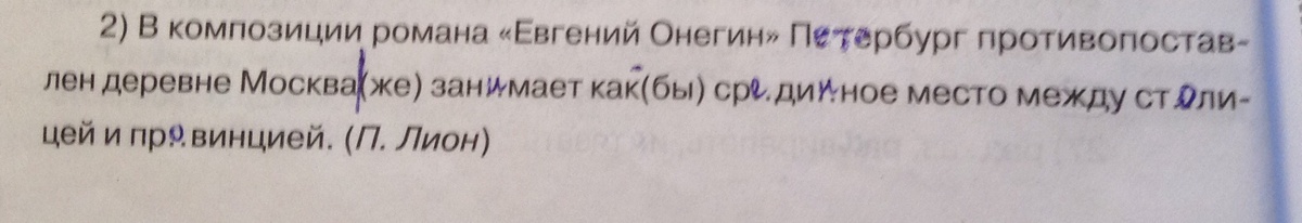 [ В композиции романа "Евгений Онегин" Петербург противопоставлен деревне] , [ Москва же занимает как бы срединное место между столицей и провинцией].