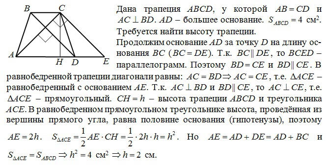 в равнобедренной трапеции диагонали взаимно перпендикулярны, а площадь равна 4 см. Найдите высоту трапеции.
