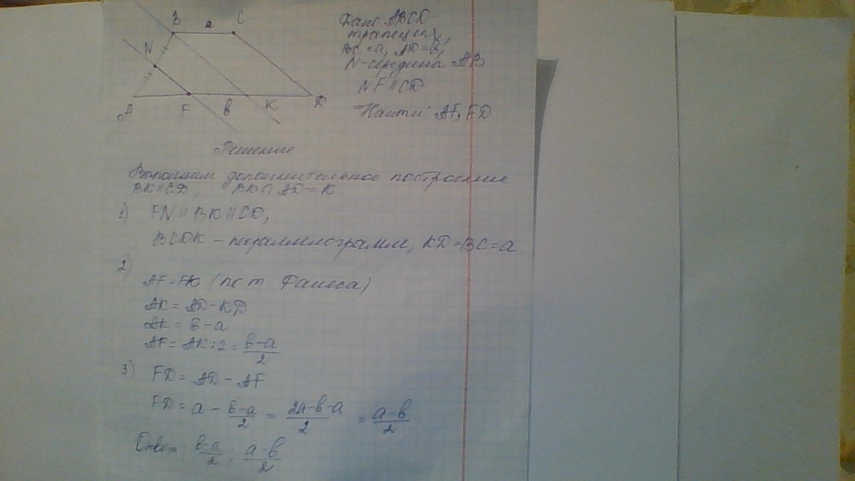 Задача : основания трапеции равно а и b. Определите длину отрезков , на которые делит большие основания прямая, которая проходит через середину одной из боковых сторон , параллельно другой боковой стороне трапеции.