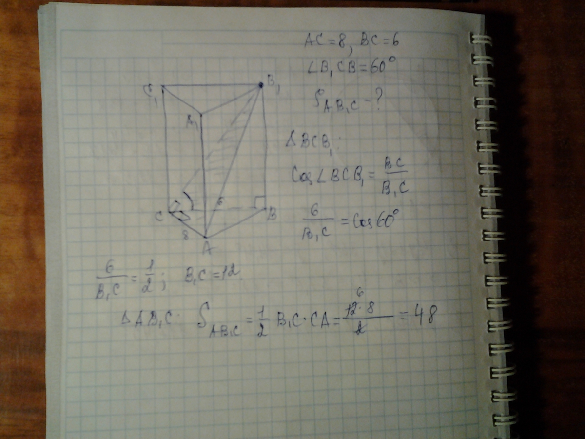 В основании прямой призмы лежит прямоугольный треугольник с катетами 8 см и 6 см.Через больший катет нижнего основания и противолежащую вершину верхнего основания призмы проведена плоскость ,образующая угол 60 с плоскостью основания. Вычислите площадь сечения.