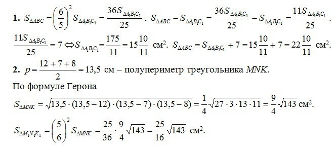 1.Треугольник АВС и А1В1С1 подобны, и их сходственные стороны относятся как 6:5.Площадь треугольника АВС больше площади треугольника А1В1С1 на 7см в 2 . Найдите площадь этих треугольников.