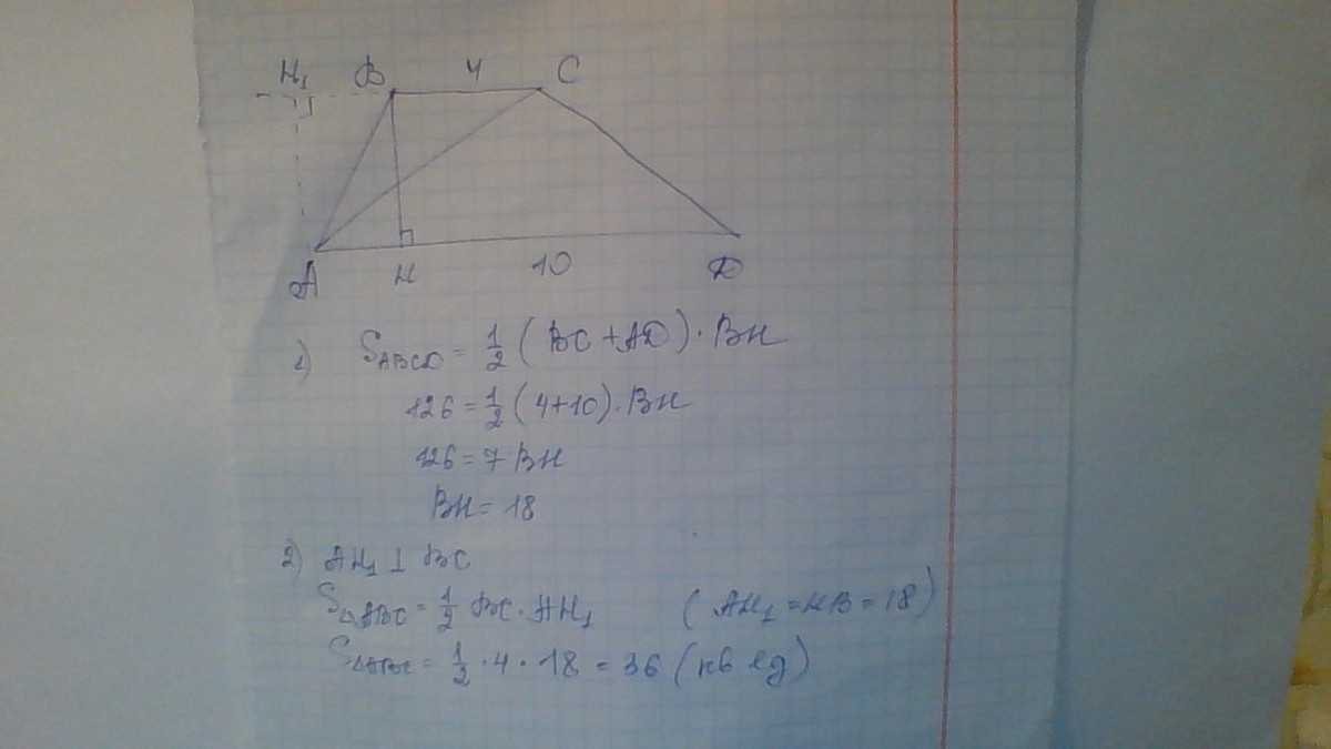 В трапеции ABCD известны длины оснований: AD=10, BC=4, а ее площадь равна 126. Найдите площадь треугольника