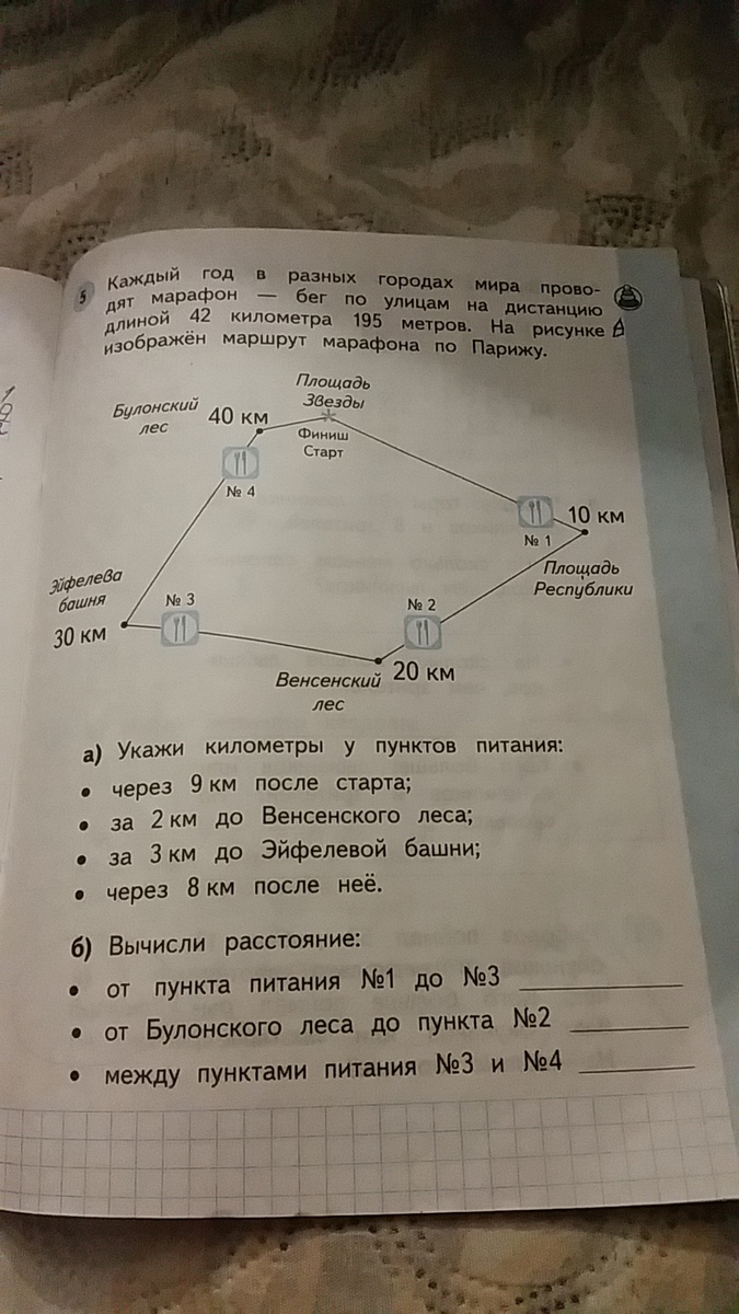 1.От площади Республики до Венского леса 10 км . От площади республики до 1 пункта питания 1 км, а 3 пункт питания находится в 7 км от Венского леса.Значит: