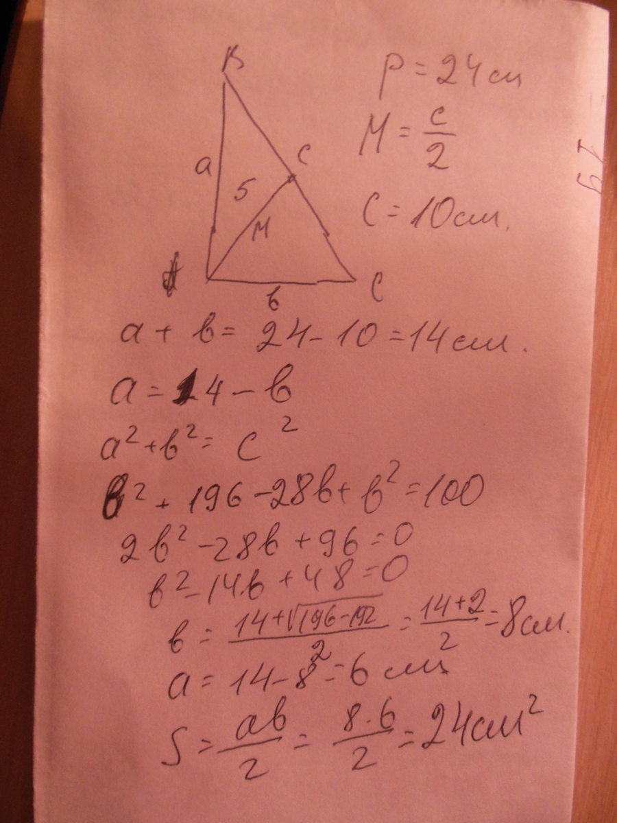 Периметр прямоугольно треугольника АВС равен 24 см, длина медианы, проведённой к гипотенузе 5 см. Найдите площадь треугольника АВС