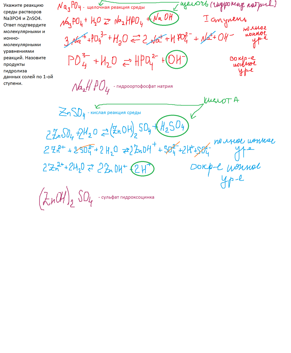 Укажите реакцию среды растворов Na3PO4 и ZnSO4. Ответ подтвердите молекулярными и ионно-молекулярными уравнениями реакций. Назовите продукты гидролиза данных солей по 1-ой ступени.