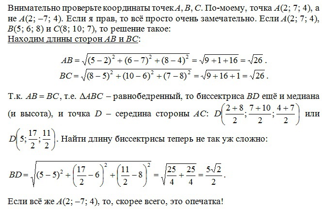 Очень срочно надо, пожалуйста help me!Даны координаты вершин треугольника ABC A(2;-7;4) B(5;6;8) C(8;10;7). Найти длину биссектрисы AD