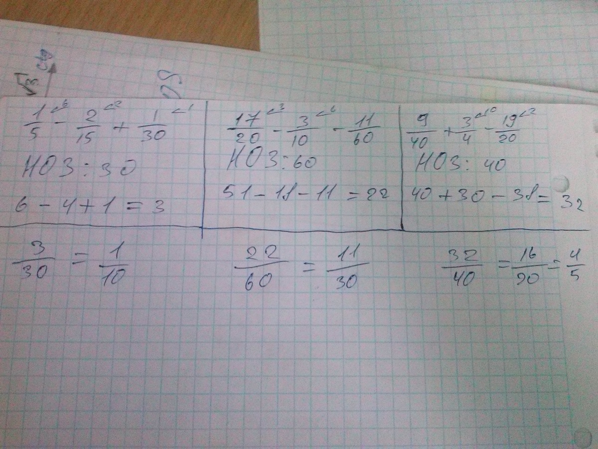 Вычислите: 1/5 - 2/15 + 1/30; 17/20 - 3/10 -11/60; 9/40 + 3/4 - 19/20