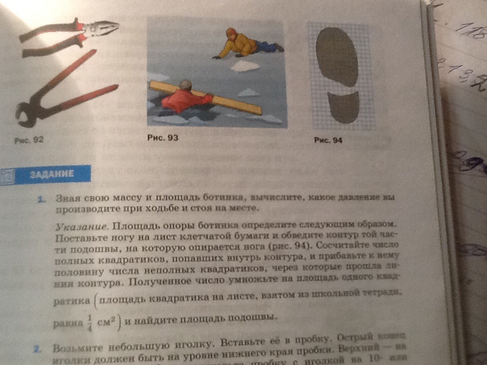 S1 = So*(767+186*1/2) = 0,25*(767+186*1/2) см^2 = 215 см^2 = 0,0215 м^2 - площадь подошвы одной ноги