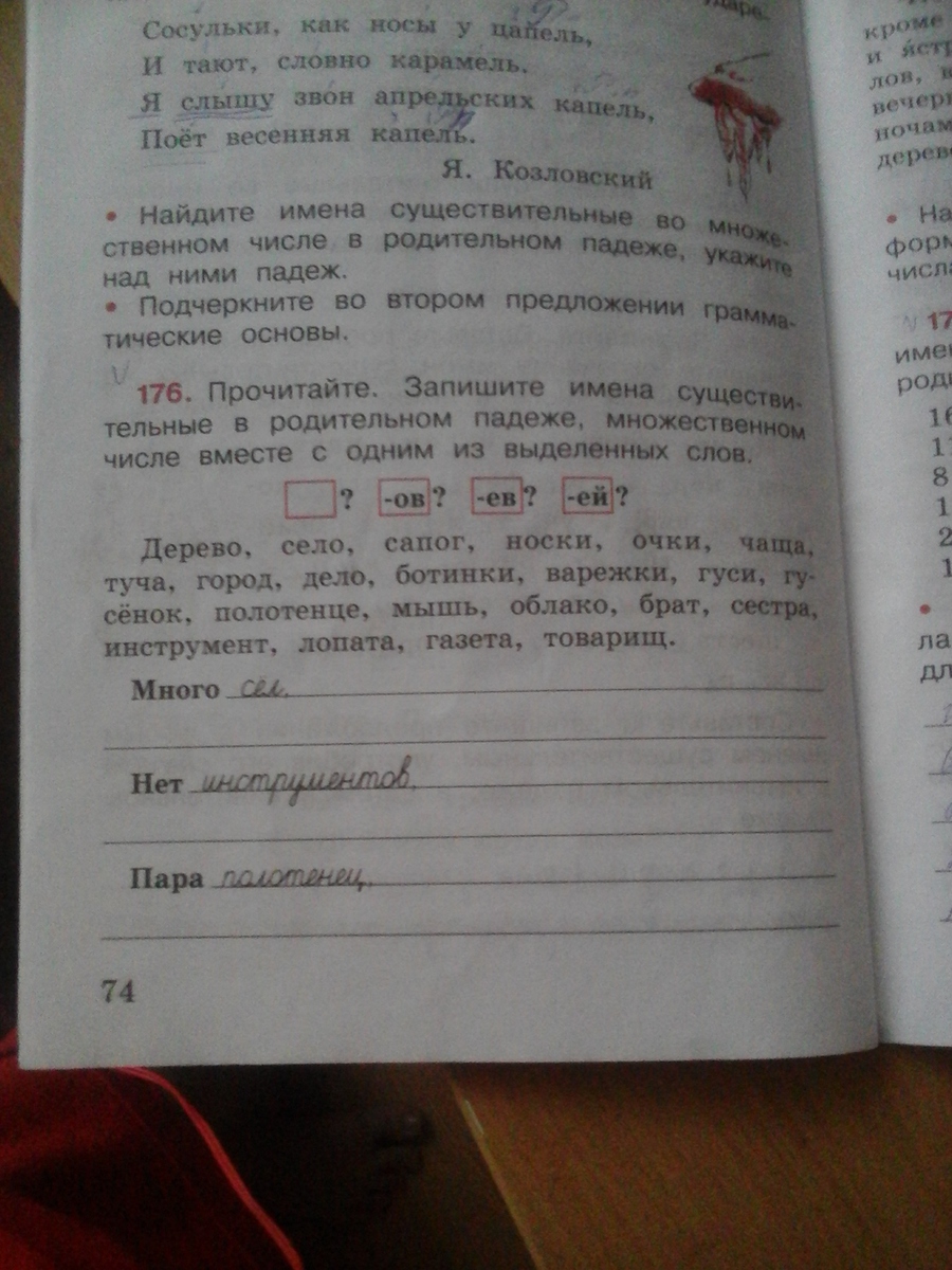 Нет деревьев, много сел, пара сапог, пара носков, нет очков, много чащ, много туч, нет городов, много дел, пара ботинок, нет варежек, много гусей, пара полотенец, нет мышей, много облаков, нет сестер, нет инструментов, много лопат, много газет, нет товарищей.
