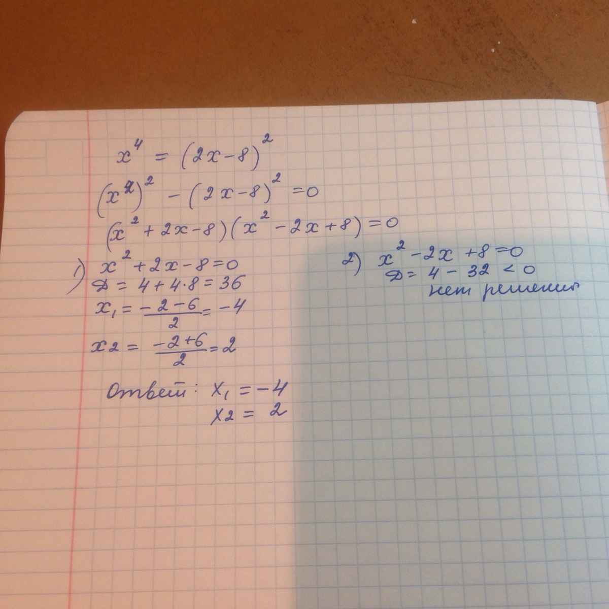 решите уравнение х^4=(2х-8)^2