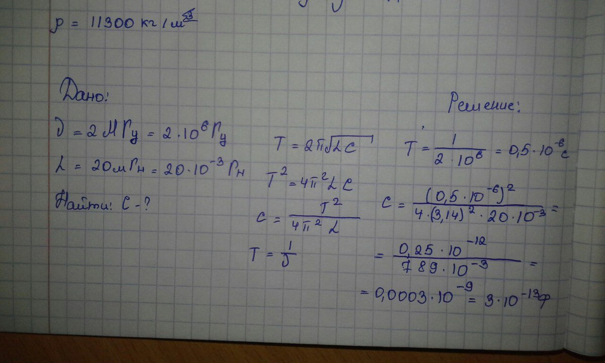 Радиопередатчик работает на частоте 2 Мгц. Рассчитайте ёмкость конденсатора, если индуктивность катушки 20мГн.