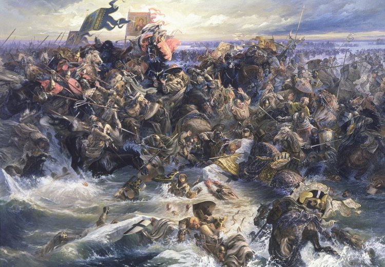Невский в центре на коне наносит удар врагу, от него исходит невообразимая передача энергии которую изобразил художник, он самый первый бросается в глаза