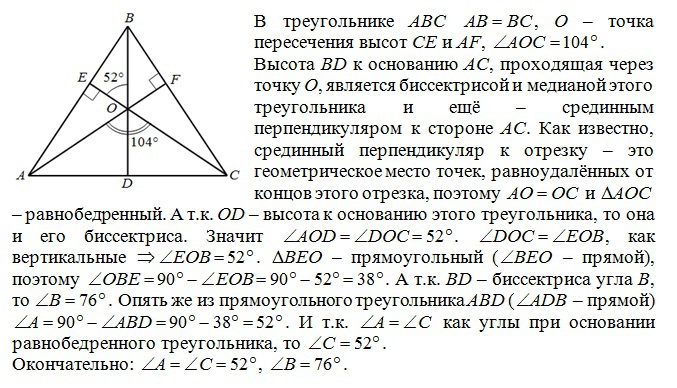 Висоти при основі рівнобедренного трикутника перетинаються під кутом 104 градуси .Знайти кути трикутника