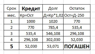 2) 1000*2% = 1000 * 0,02 = 20 т.р/мес - процент по кредиту и МЕНЬШЕ