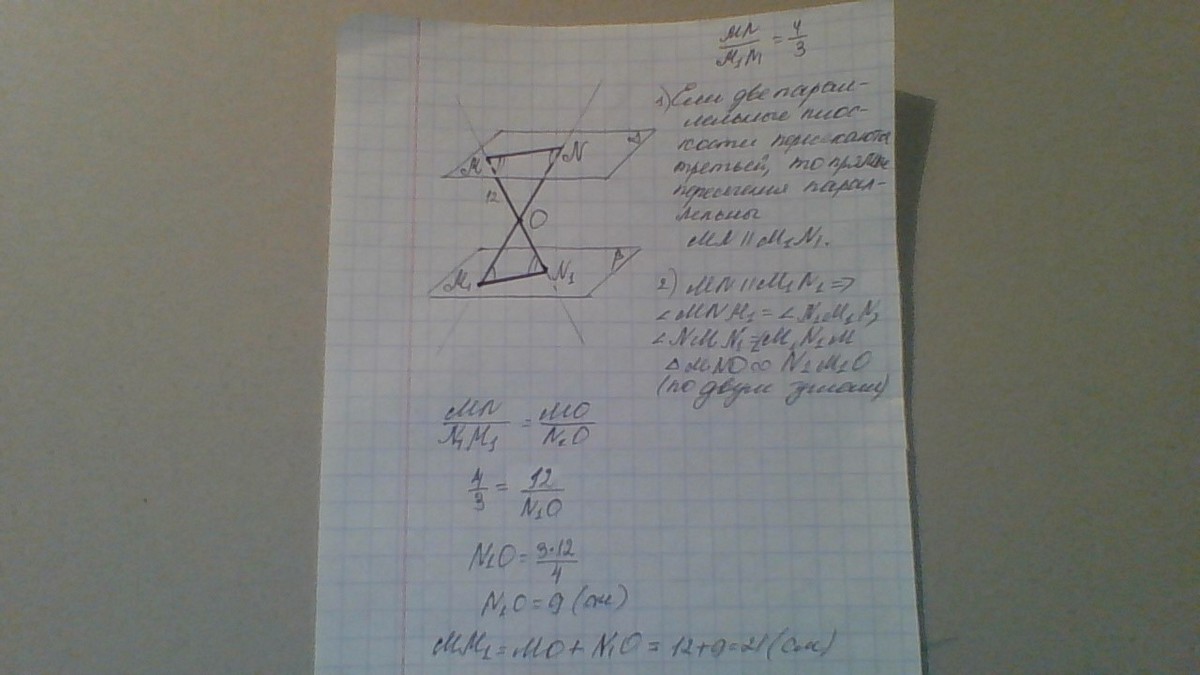 Плоскости альфа и бета параллельны. Отрезок MN расположен в плоскости альфа. Через его концы в точку О, лежащую между плоскостями проведены прямые, которые пересекают плоскости бета в точках М1 и N1. Найти длину отрезка ММ1, если МО = 12 см и MN:M1N1 = 4:3