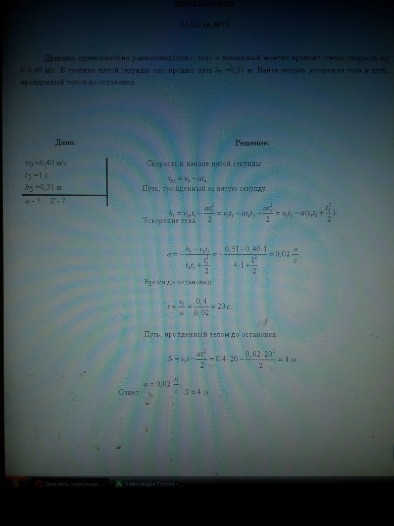 Двигаясь прямолинейно равнозамедленно, тело в начальный момент времени имело скорость v0 = 0,40 м/с. В течение пятой секунды оно прошло путь 5 = 0,31 м. Найти модуль ускорения тела и путь, пройденный телом до остановки