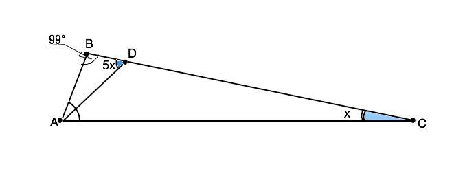 В треугольнике ABC угол В равен 99 градусов,AD-биссектриса угла А,угол С меньше угла ADB в пять раз.Найдите градусную меру угла С.