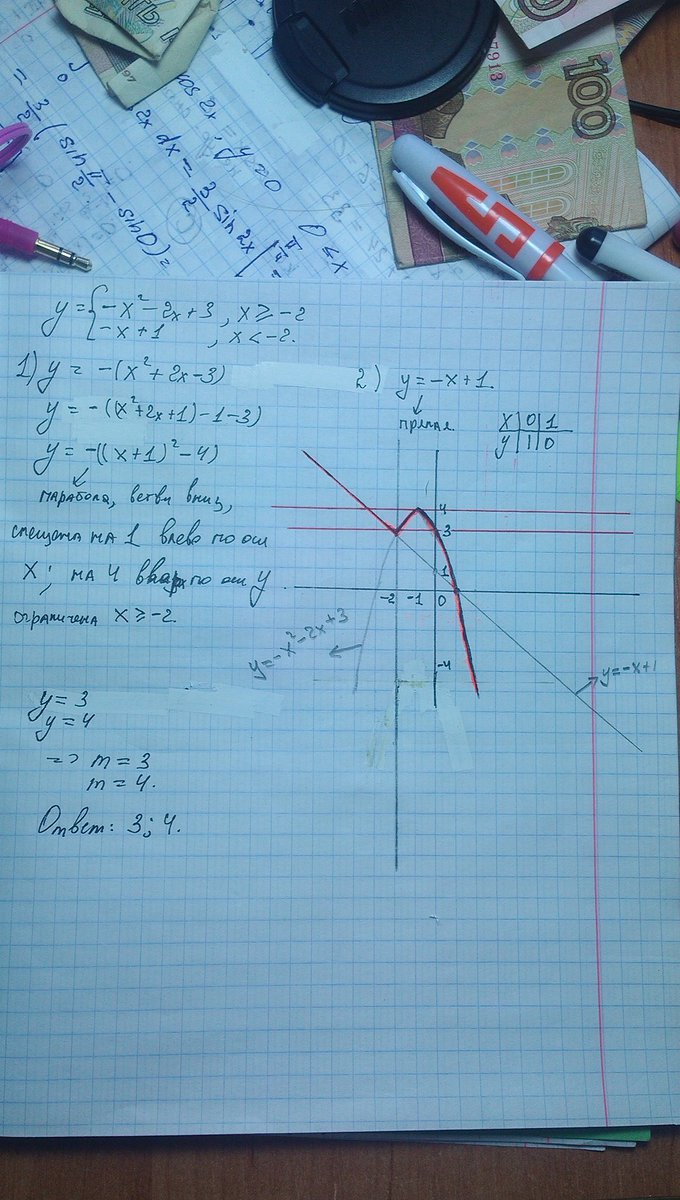 оранжевое с черным- график функции, а красные горизонтальные линии- у=m