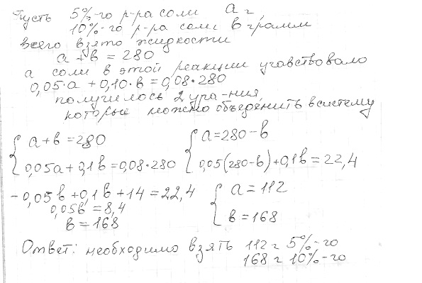 сколько 5-ти процентногои сколько 10-ти процентного растворов соли нужно взятьчтобы получить 280 г 8-ми процентногораствора соли? помогите*)))