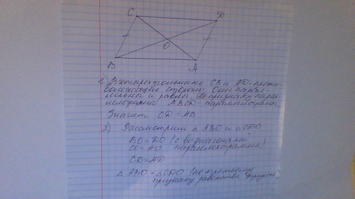 2. Отрезки BD и CA пересекаются в точке О, известно что BC параллельно AD и BC=DA. Докажите, что треугольник ABO равен треугольнику DOC.