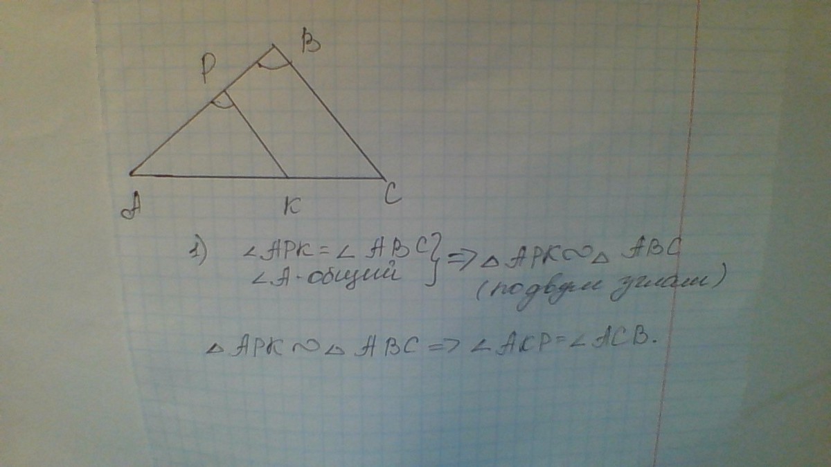 1. На сторонах AB и AC треугольника ABC отмечено соответственно точки P и K так, что угол APK равен углу ABC. Докажите, что угол AKP равен углу ACB.