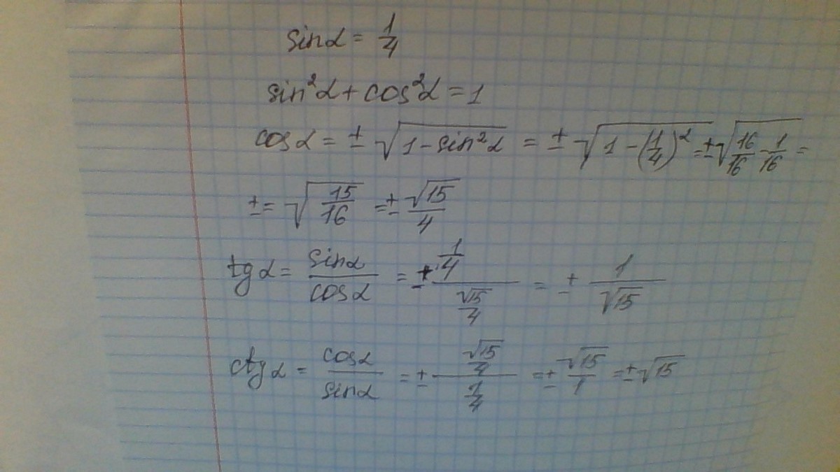 Найдите cosα, tgα и ctgα если sinα= 1/4