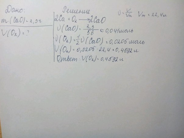 вычислите объём кислорода если в реакцию соединения вступила кальций и кислород и получен продукт реакции массой 2,3г