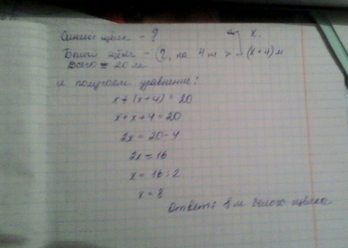 всего купили 20метров шёлка белого и синего, причём белого на4 метра больше синего. сколько метров синего шёлка купили?