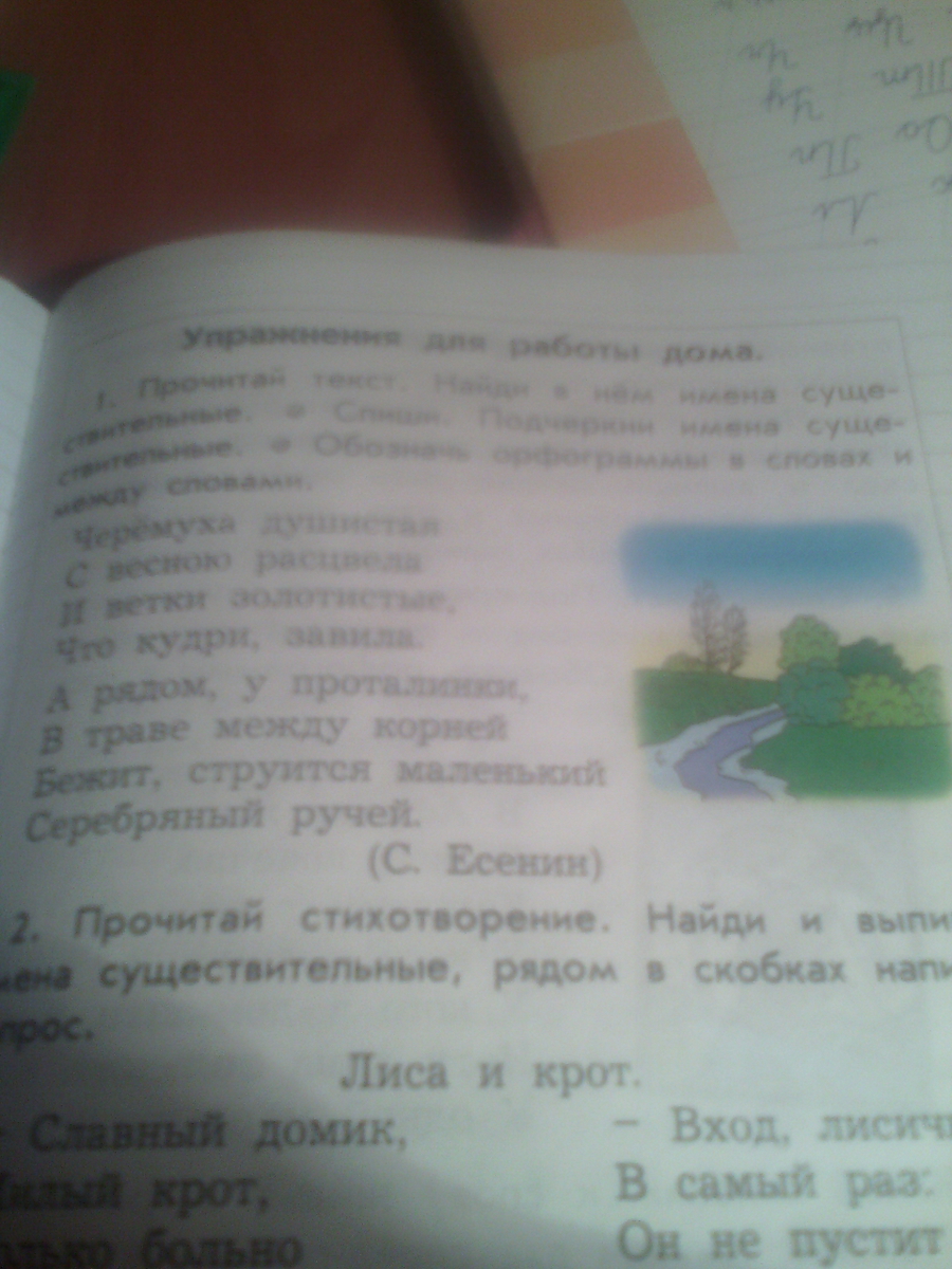 черемуха,весною,ветки,кудри,проталинки,,в траве,между корней,ручей.-существительные.