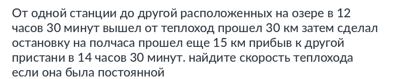 В итоге так: время в пути= 1,5 ч., расстояние=45 км. Скорость равна 7, 5 км в ч..