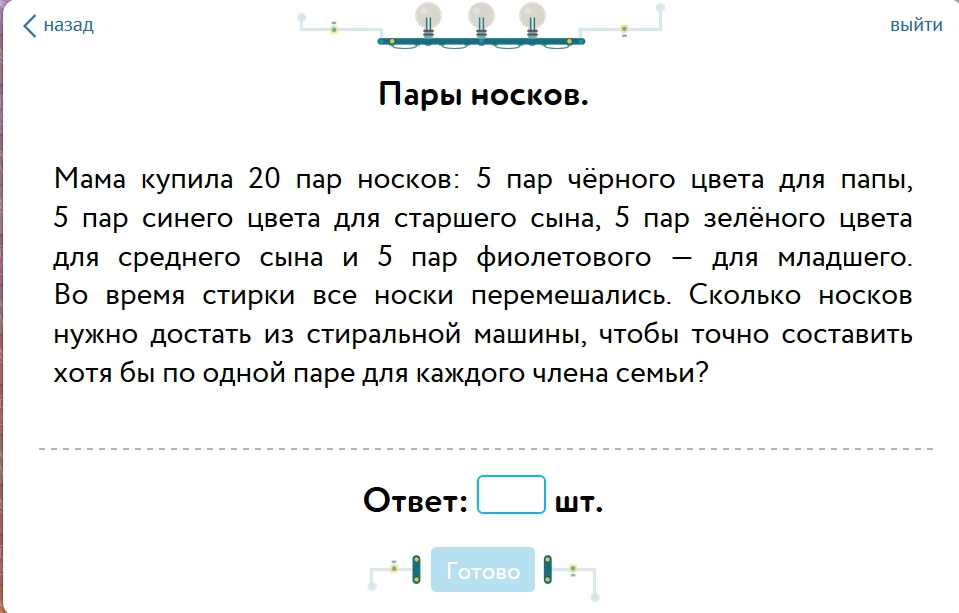Решение: Всего 20*2=40 носков. Представим, что нам не повезло и мы вытаскиваем сначала носки черного цвета, потом- синего , далее- зеленого и только потом - фиолетового. Значит, сначала нам надо вытащить (5+5+5)*2=30 носков, а потом еще 2 носка оставшегося цвета. Тогда 100% получим по паре носков одного цвета.