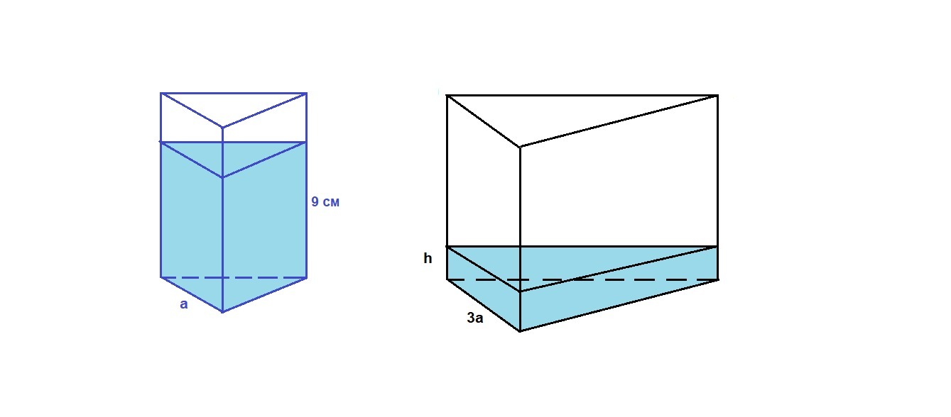 В сосуд, имеющий форму правильной треугольной призмы, налили воду. Уровень воды достигает 9 см. На какой высоте будет находиться уровень воды, если ее перелить в другой такой же сосуд, у которого сторона основания в 3 раза больше, чем у первого?
