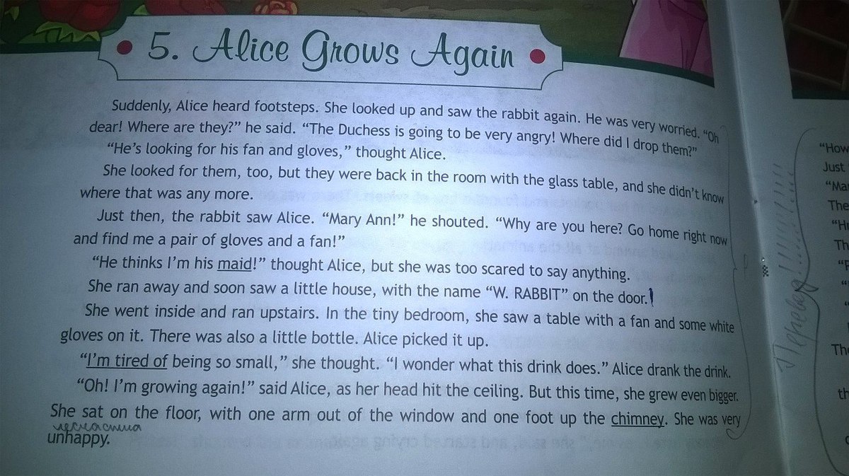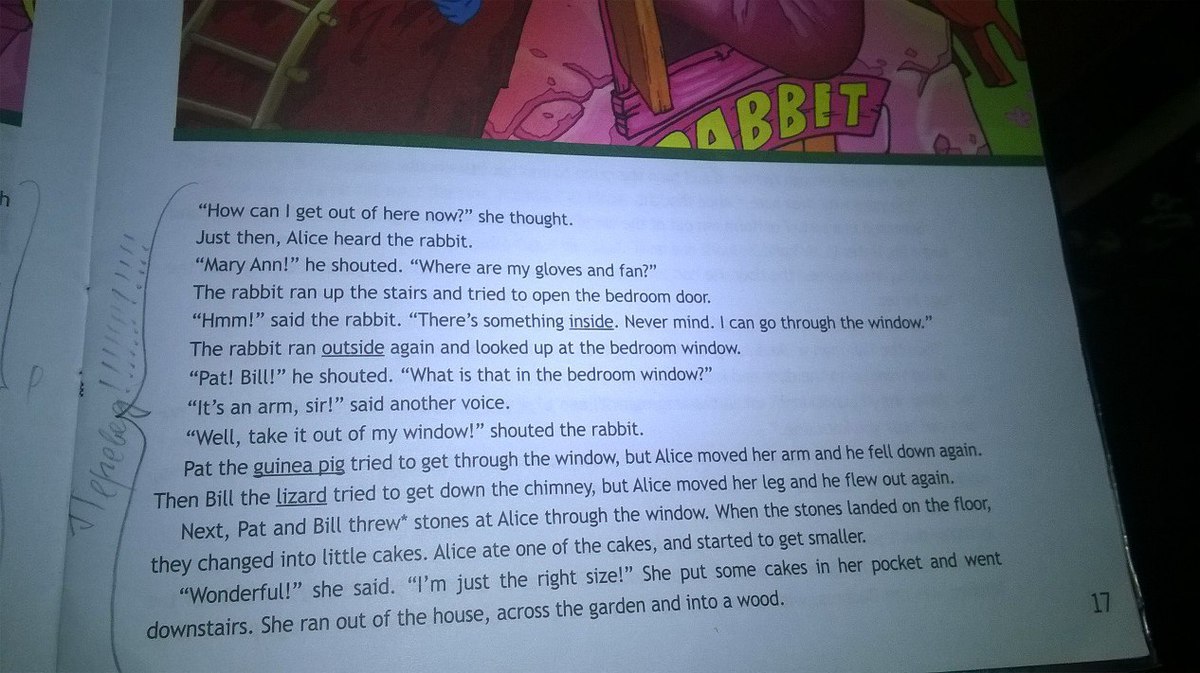 "Как можно выйти из здесь сейчас?" она думала, что же тогда, Алиса услышала кролика. "Мэри Энн! '' Закричал он. Мои перчатки и поклонник?" Кролик побежал вверх по лестнице и попытался открыть дверь спальни. "Хм!" сказал кролик. "Там что-то внутри. Ничего. Я могу пойти througn в wrndow. Кролик выбежал снова и посмотрел в окно спальни." Пэт Билл! "Кричал он." Что такое "Это рука, сэр!", Сказал другой Голос "Ну, возьмите его из моего окна!" кричал кролика. Пэт свинки пытался через окно. Алиса переехала ее руку, и он тогда Билл lizatd пытались получить вниз дымоход, но Алие переехал ее нога andhe мало в следующем, Пэт и Билл бросали камни в Элис через окно. Когда камни приземлился GN они изменили в маленьких пирожных. Алиса съел один из тортов, и начал получать меньше. "Замечательно!" сказала она. "Я правильный размер! "Она положила несколько торты в кармане только дома, через сад и в лес.