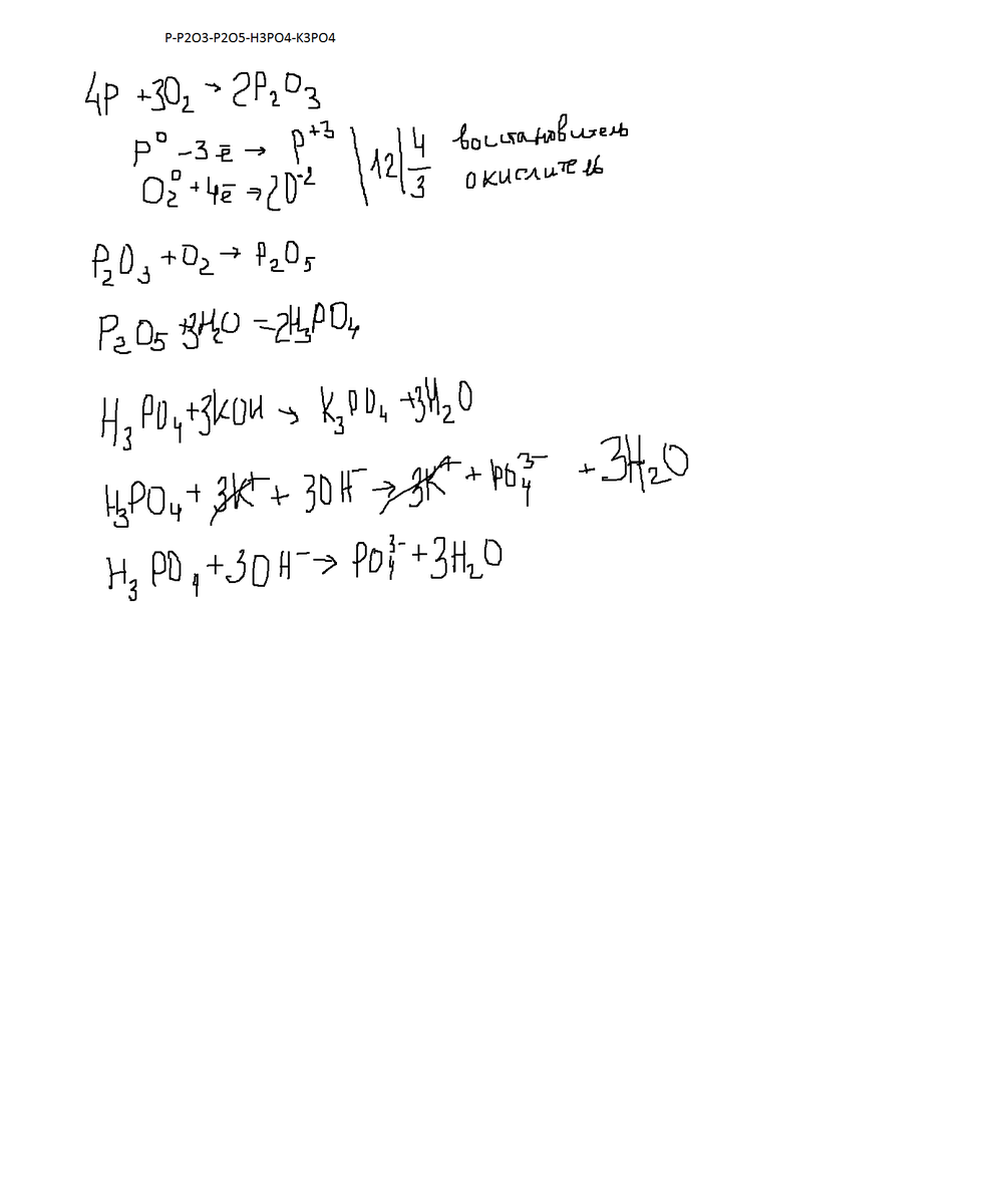 осуществить превращение ,написать в цепочке одно уравнение в ионном виде,а одно уравнение в окислительном восстановительным виде?P-P2O3-P2O5-H3PO4-K3PO4 Помогите пожайлуста!!!