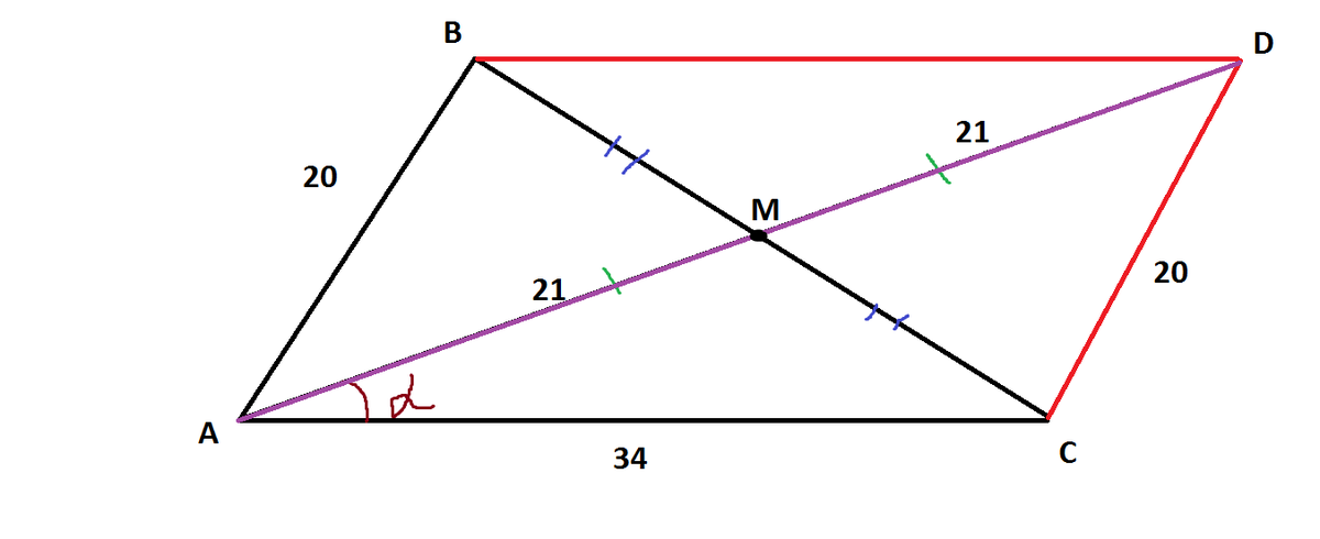затем из точки М продолжим эту медиану до точки D так, что MD=AM=21.