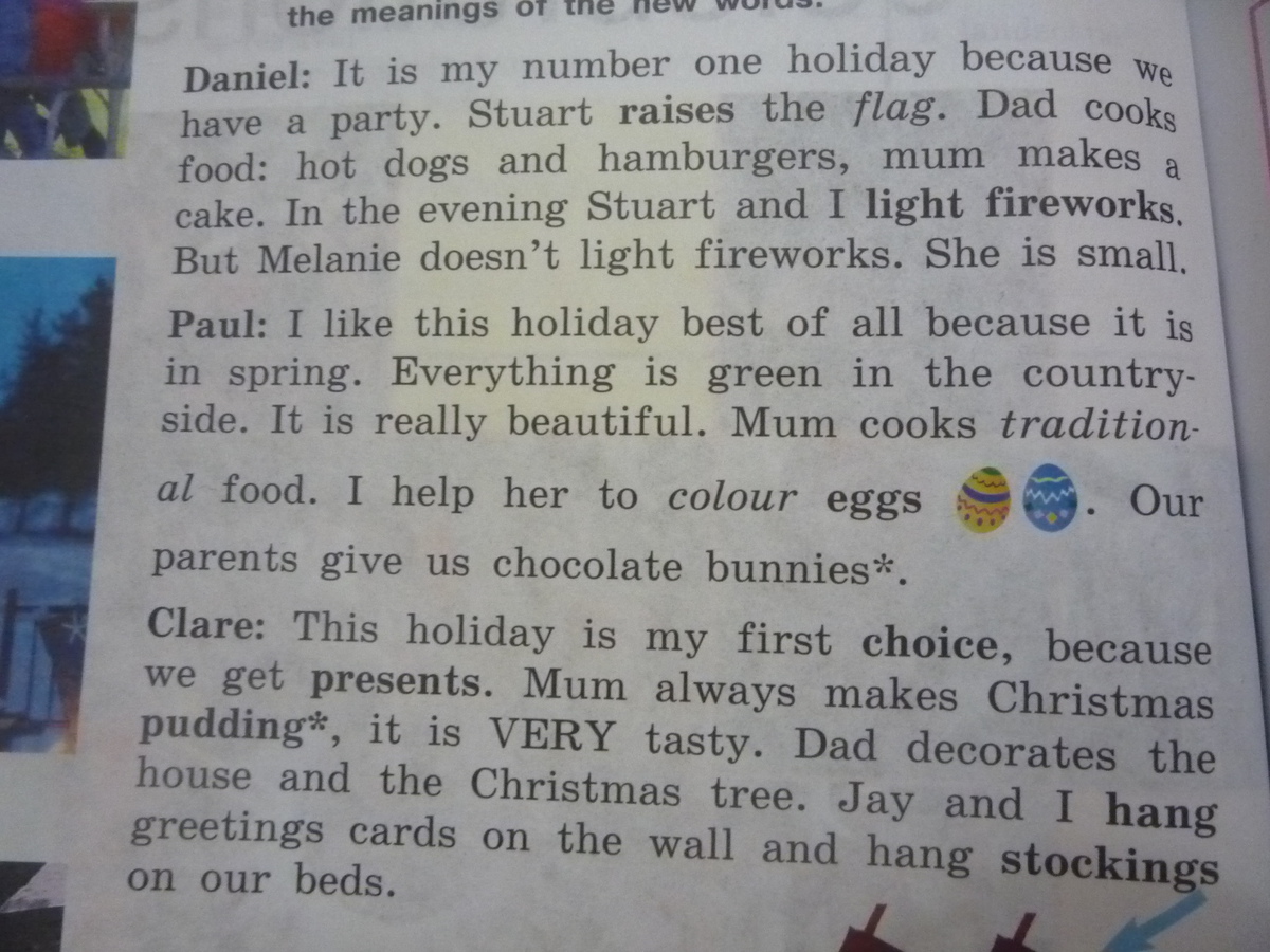 Пол: я люблю этот праздник потому-что он весной. Везде всё зелёное в сельской местности. Это правда прекрасно. мама готовит традиционную еду. я помогаю ей докрасить яйца. остальные родные делают шоколадных кроликов.