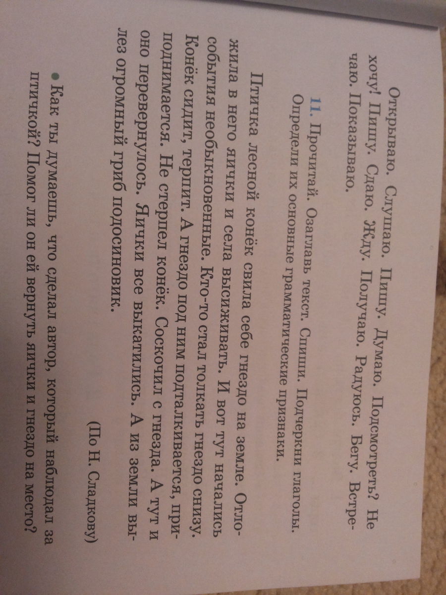 Глаголы:свила, отложила, села высиживать, начались, стал толкать, сидит, терпит, подталкивается, приподнимается, стерпел, соскочил, перевернулось, выкатились, вылез.