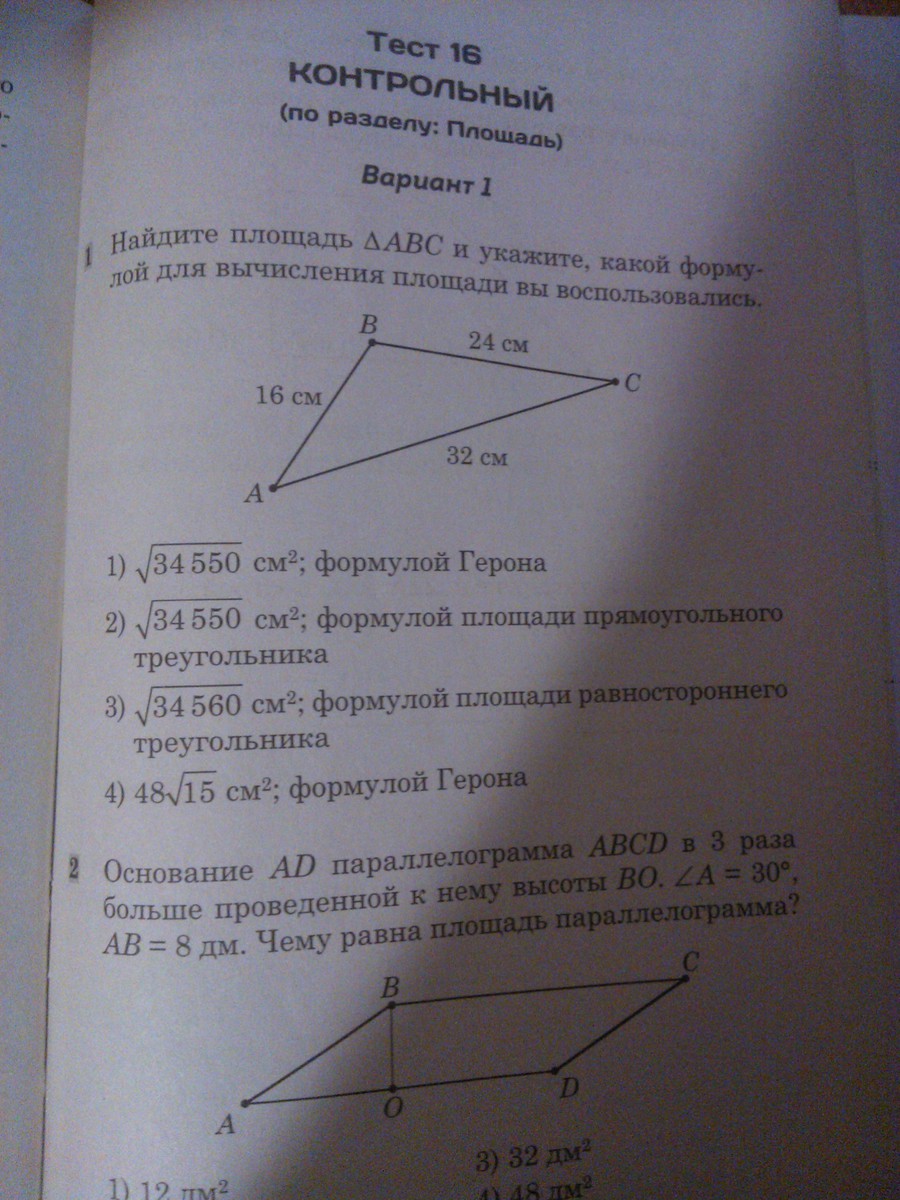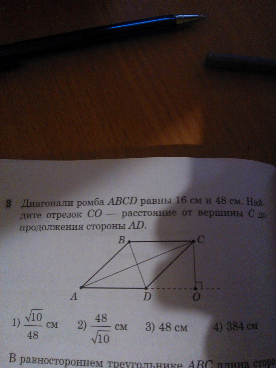 Это площадь треугольника; 4S=384-площадь ромба; но если рассматривать фигура как параллелограмм, то S=AD*CO=384; AD=корень(8^2+24^2)=корень из 640=8 корней из 10; S=8 корень из 10*СO=384; C0=384/8кореньиз10=48/корень из 10. Ответ:2)