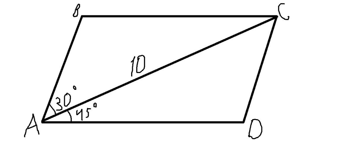 В параллелограмме ABCD диагональ AC=10. Найти площадь параллелограмма ABCD, если угол BAC=30°, угол DAC=45°.