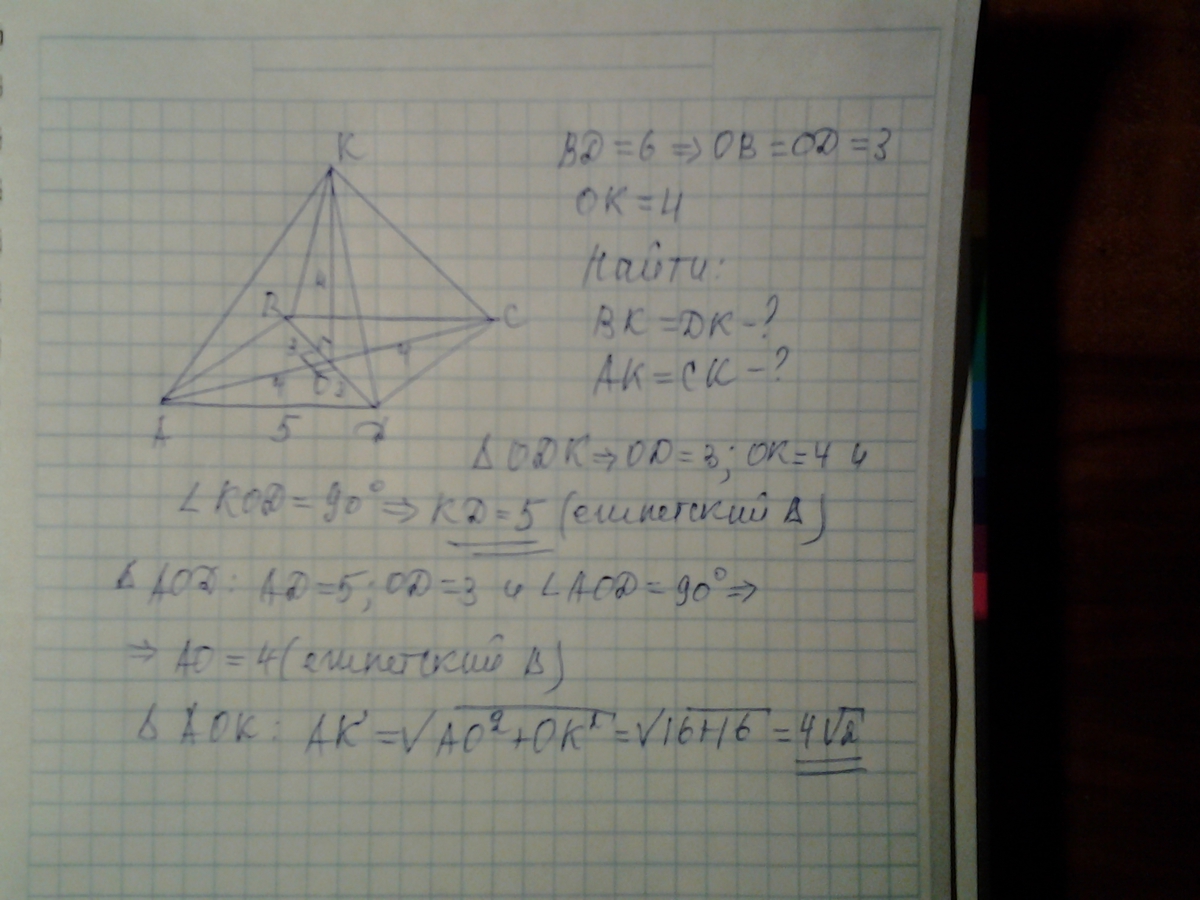 Длина стороны ромба АВСД равна 5 см.,длина диагонали ВД равна 6 см.Через точку О пересечения диагоналей ромба проведена прямая ОК,перпендикулярная его плоскости.Найдите расстояние от точки К до вершин ромба,если ОК=4 см.помогите пожалуйста,если можно с чертежом!